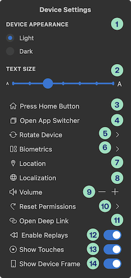 Biometrics - options for simulating biometric authorization on iOS. This option isn't available on Android. The following options are available: