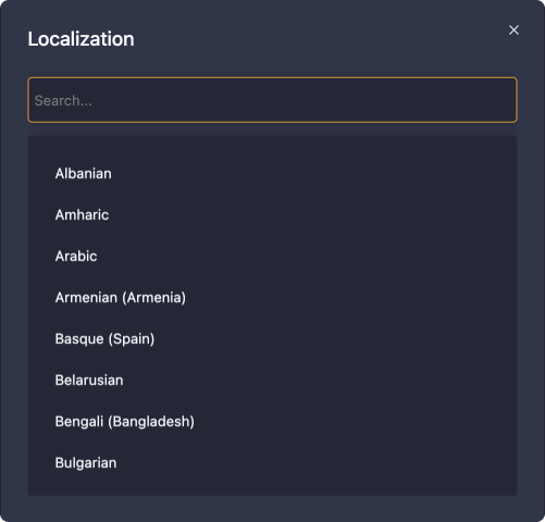 - Localization - allows to set the device localization. Changing the localization setting reboots the device. This option isn't available on Android.